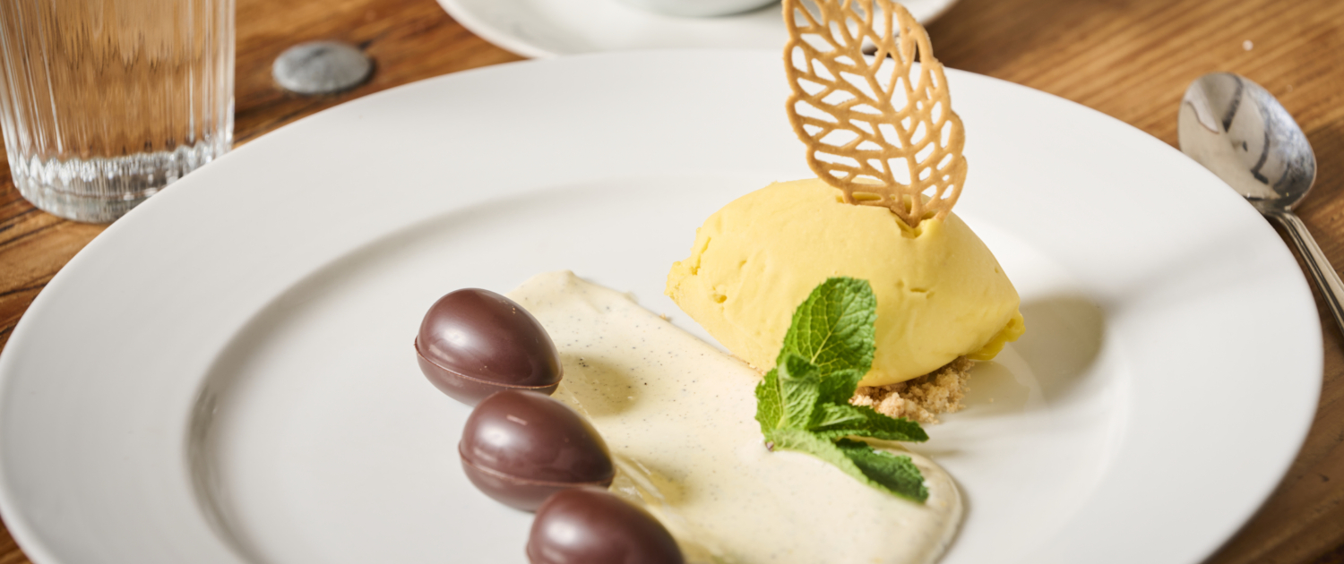 Fyldte påskeæg anrettet med crème Anglaise, hjemmelavet mangosorbet og sprød mandeltuile.